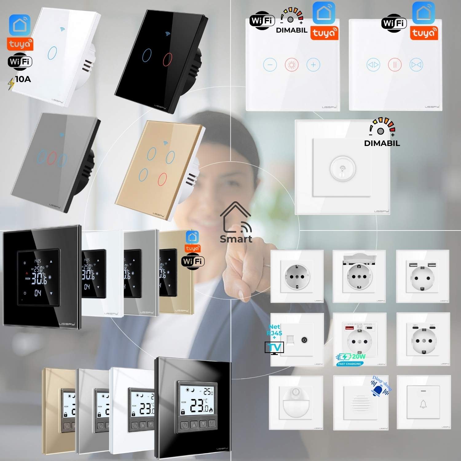 - Control Inteligent: Întrerupătoare touch si dimabile, disponibile atât în variantă simplă, cât și cu control de la distanță prin aplicație.
