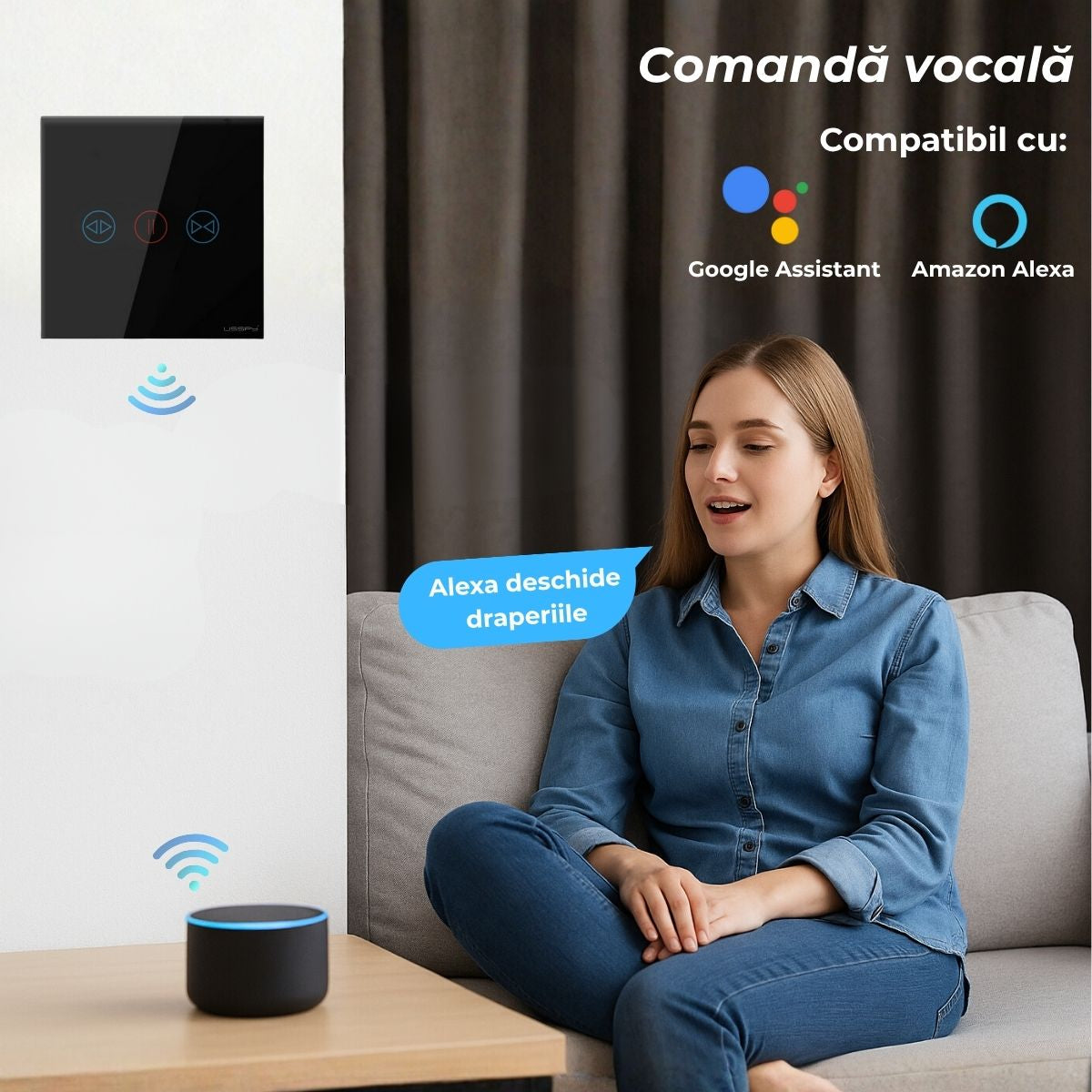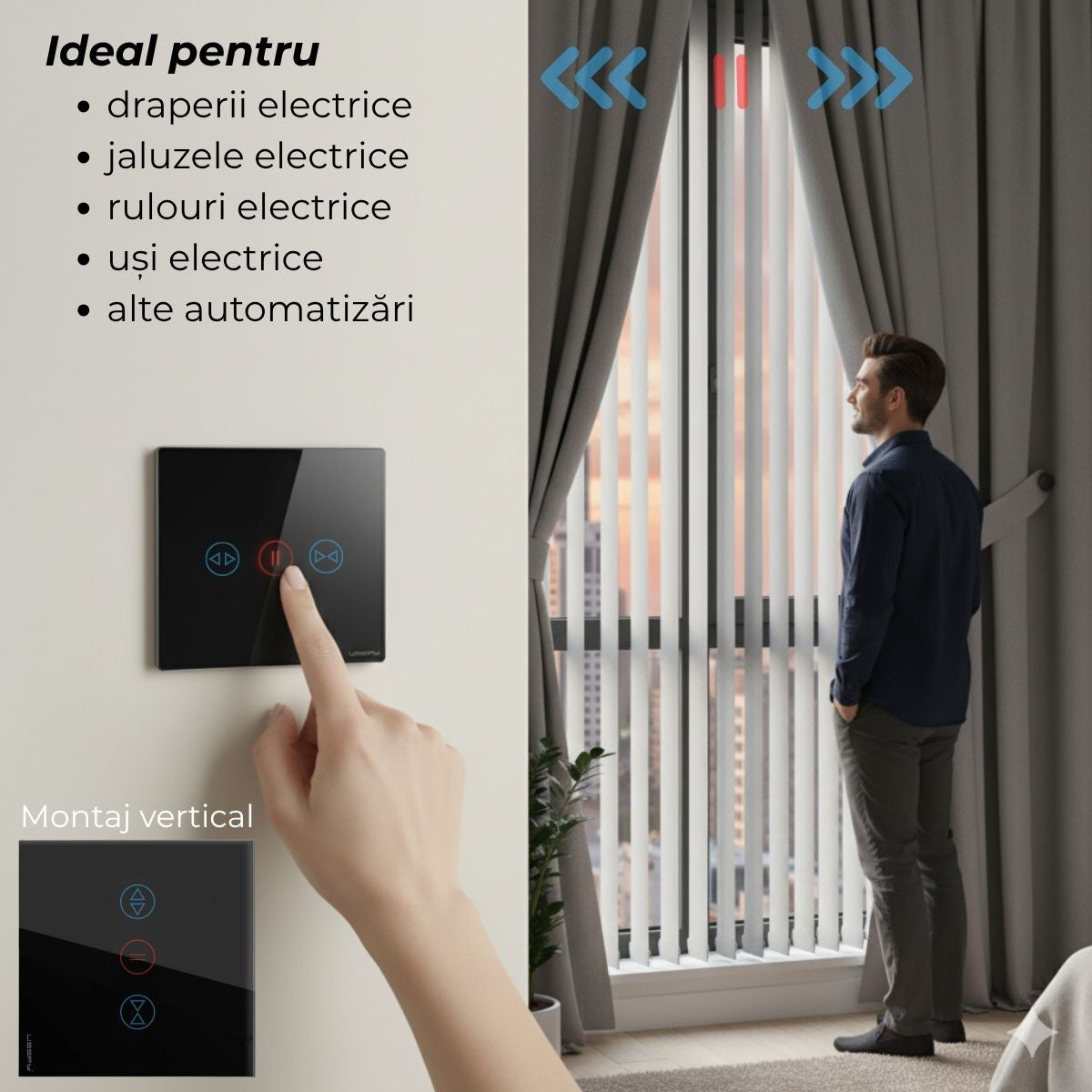 Intrerupator cu touch draperii, rulouri, jaluzele, USSPY®, sticla securizata, Wifi, 1500W, Tuya, Smart Life, negru