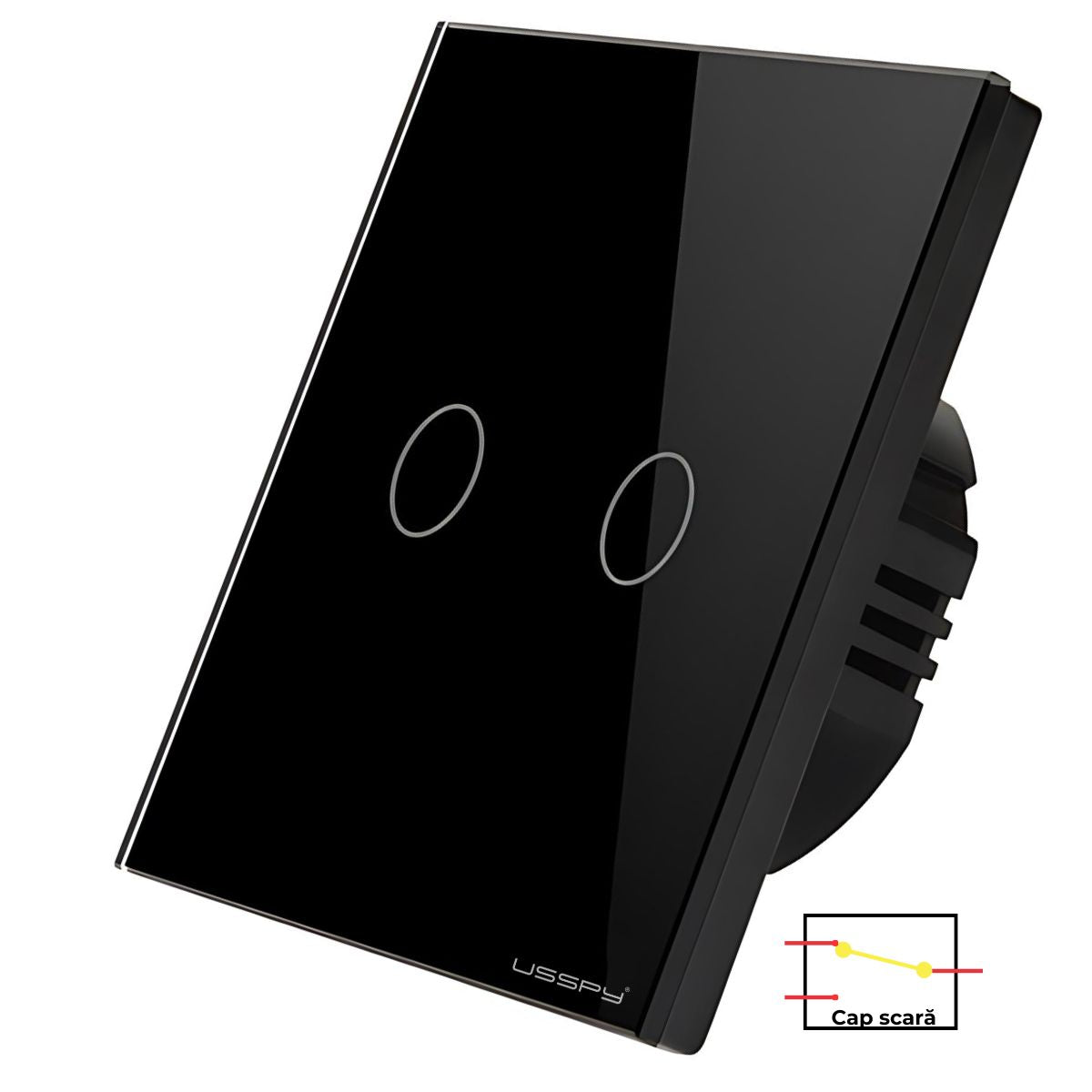 Intrerupator simplu touch, cap scara, rama sticla securizata, USSPY®, 2 canale, negru