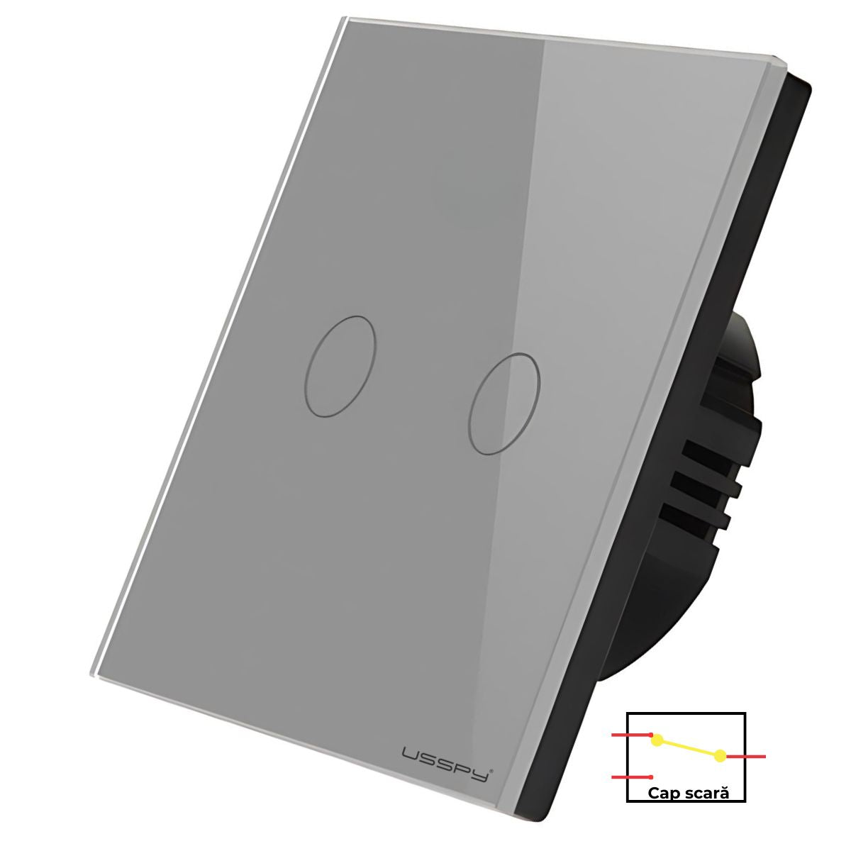 Intrerupator simplu touch, cap scara, rama sticla securizata, USSPY®, 2 canale, gri